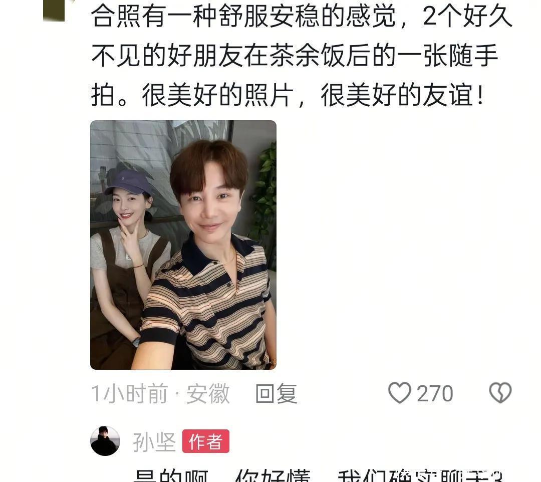 孙坚与唐嫣的心思的确很好,唐嫣说过孙坚是像家东谈主相通的一又友!孙坚的一又友圈每年也会出现唐嫣的身影,在他俩身上,男女之间是有纯友谊的。