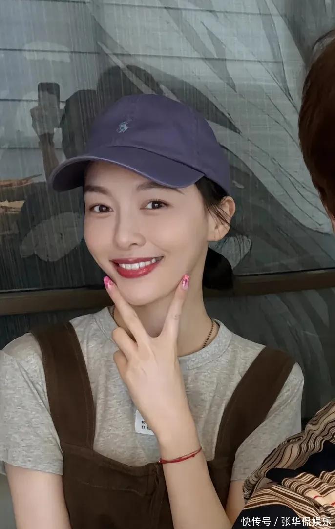 合照中,唐嫣衣服咖色背带裤,内搭灰色的短袖,头戴蓝色鸭舌帽,妆容精细又明媚。